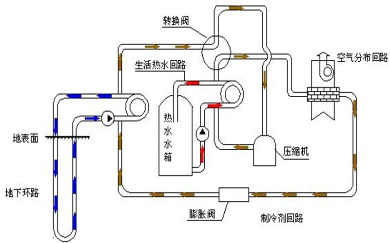 在制冷狀態(tài)下,通過(guò)壓縮機(jī)對(duì)冷媒做功,使其進(jìn)行汽-液轉(zhuǎn)化循環(huán)。冷媒的蒸發(fā)由風(fēng)機(jī)盤管循環(huán)所攜帶熱量吸收至冷媒中,再由水路循環(huán)吸收冷媒所攜帶的熱量,轉(zhuǎn)移至地下水。在供暖狀態(tài)下,使壓縮機(jī)對(duì)冷媒做功,通過(guò)換向閥將冷媒流動(dòng)方向。吸收地表水、地下水或土壤里的熱量,通過(guò)水路循環(huán)中的熱量吸收至冷媒中,在冷媒循環(huán)的同時(shí)再通過(guò)蒸發(fā)器內(nèi)冷媒的冷凝,由風(fēng)機(jī)盤管循環(huán)將冷媒所攜帶的熱量吸收。兩種模式通過(guò)熱量傳遞工作。