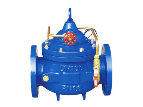 當(dāng)閥門從進(jìn)口端給水時(shí),水通過微型過濾器、針閥和單向閥進(jìn)入主閥控制室,再經(jīng)過球閥排水至到下游位置。因?yàn)獒橀y開度小于球閥的開度,即主閥控制室的排水速度大于了進(jìn)水速度,因此控制室的壓力降低,作用于主閥盤下端的進(jìn)口壓力打開主閥來向下游供水。當(dāng)管道停止供水時(shí),如若下游水開始回流,一部分回流水就經(jīng)球閥進(jìn)入了主控制室,由于單向閥作用,回流水不能夠從主控制室流出,引起了主控制室逐漸升壓,緩緩地關(guān)閉主閥。